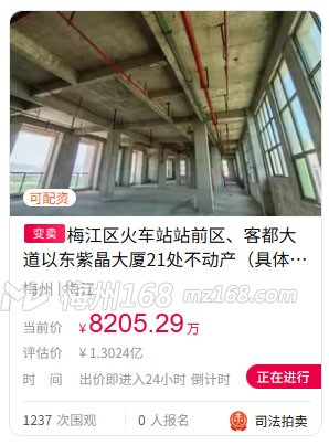 梅江區(qū)火車站站前區(qū)、客都大道以東紫晶大廈21處不動產于2025年11月9日10時至2026年1月8日10時止(延時的除外)進行公開拍賣。起拍價為人民幣82052987.94元(在第一次起拍價人民幣91169986.6元的基礎上下調10%)。