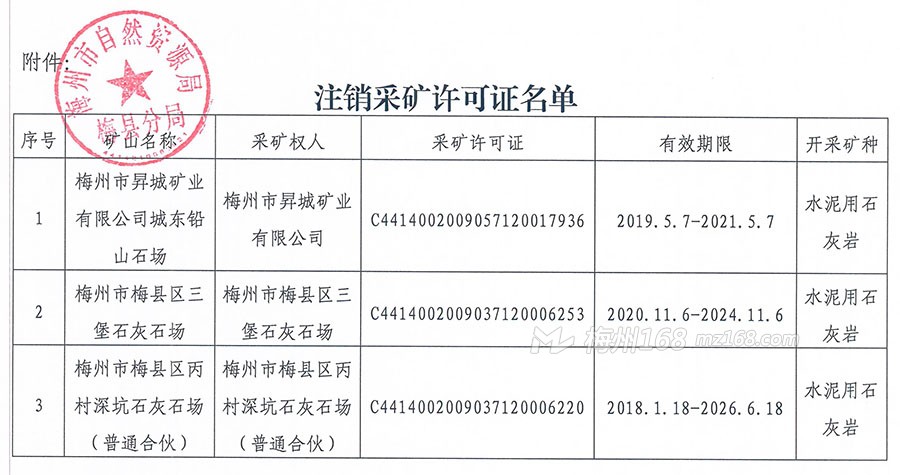 關(guān)于注銷梅州市梅縣區(qū)3個采礦許可證的公告