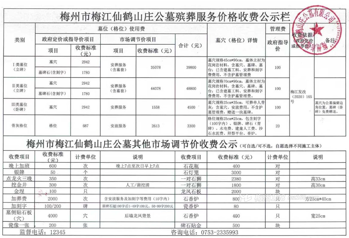 梅州市梅江仙鶴山莊公墓殯葬服務(wù)價(jià)格收費(fèi)公示欄